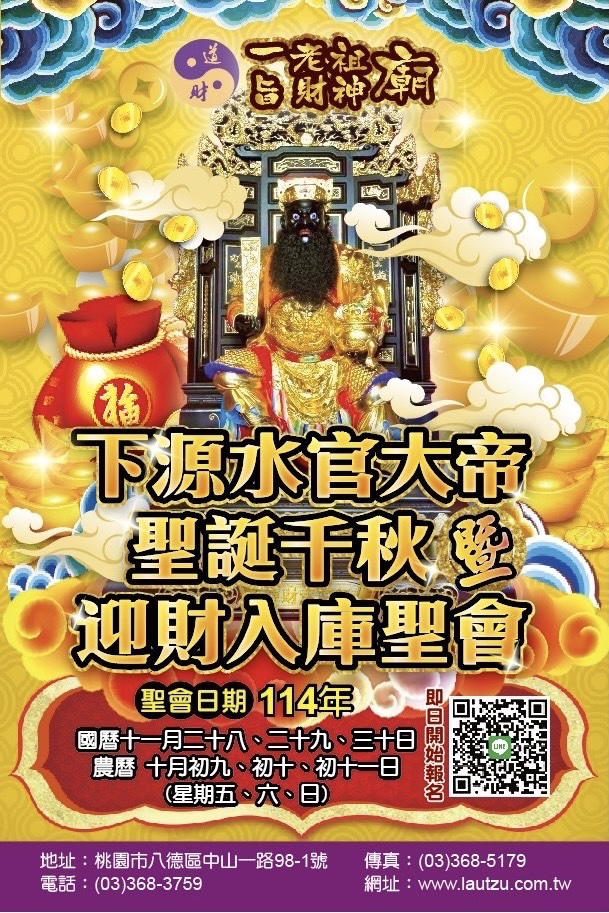 名為下源三品解厄水官洞陰大帝,每逢農曆十月十五日,即來人間校戒罪福,為人消災解厄、解冤釋結,十月十五日這天又稱解厄日,將影響未來的運勢,如健康不佳、破財傷身等,提早做消災解厄,迎接來年的貴人扶持、迎貴接富、身體健康(申請109年:年度補財與庫 財庫兩利、無形錢財與庫換有形錢財與庫)。