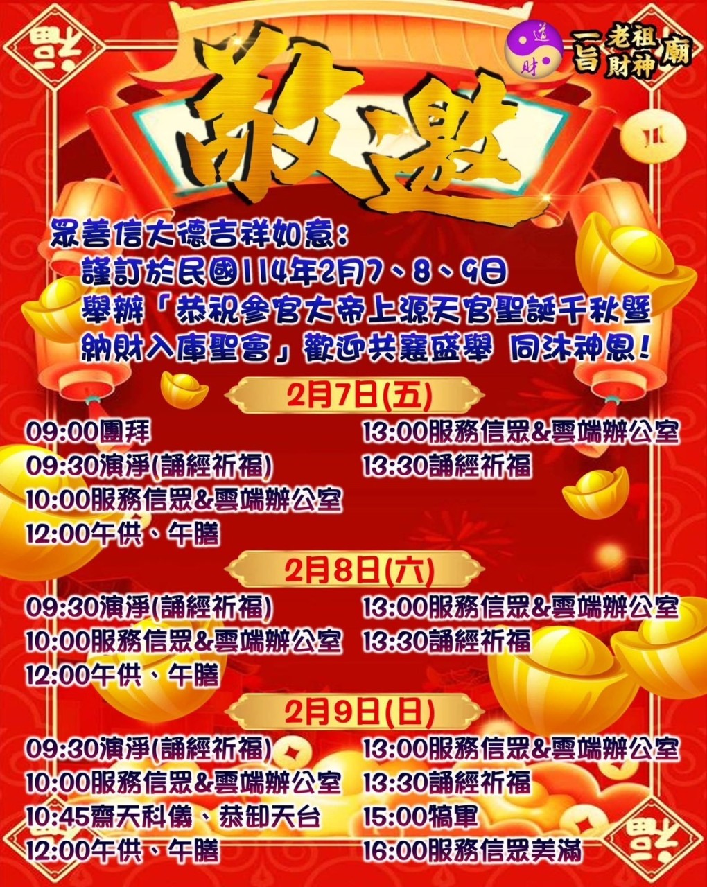 名為上源一品賜福天官紫微大帝,每逢農曆正月十五日,即下人間校定人之罪福,為人賜福消災保平安,祈求賜予福氣安康、解去厄運、免除災難。